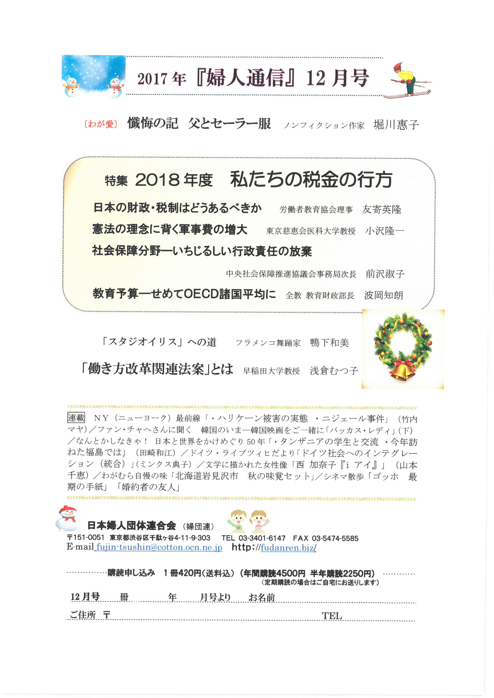 〒151―0051 東京都渋谷区千駄ケ谷4の11の9の303日本婦人団体連合会 ☎03(3401)6147 FAX 03(5474)5585