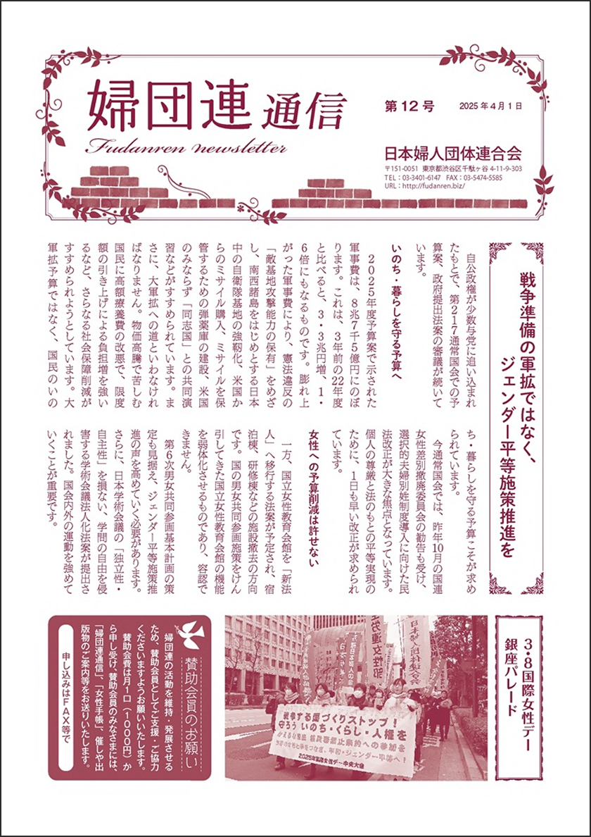 ★婦団連通信12号を4月1日に発刊しました。2025年度予算編成の問題点や、大きな焦点となっている選択的夫婦別姓導入をめぐる情勢など、今国会の特徴を伝えています。「国連女性差別撤廃委員会第9回日本政府報告審議・報告集会」、外務省が行った「CEDAW拠出金停止、委員会の訪日プログラム見合わせ」に対する婦団連をはじめ女性団体による抗議行動、日本女性差別撤廃条約NGOネットワークに結集し、外務省を招いて撤回を求めた院内集会、2025年国際女性デー中央大会・銀座パレードなど、この間の女性運動の内容と特徴を紹介。原水爆禁止日本協議会事務局長の安井正和さんが「被爆80年、核兵器禁止条約に参加する日本実現の年に」、日本民間放送労働組合連合会の書記次長の岩崎貞明さんによる「放送業界のジエンダー平等を求めて」など、現在求められている課題を明らかにしています。「世界の女性たち」は、婦団連を訪問したキューバ共和国大使との交流など。ジエンダー4署名の取り組みを強め、5月21日に署名提出をします。